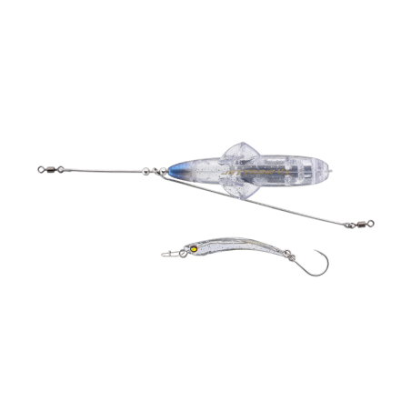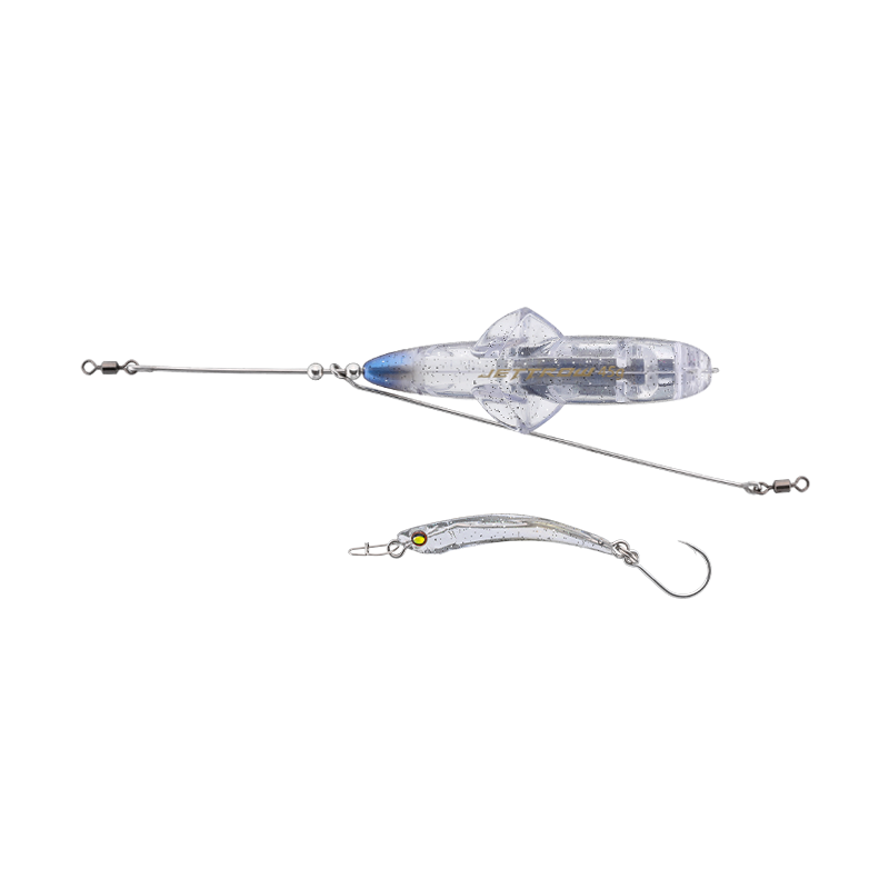 Le leurre souple Shirasu qui l’accompagne reproduit fidèlement un petit poissonnet translucide, une proie naturelle incontournable pour de nombreux carnassiers marins. Sa nage vibrante et fluide, associée à un rolling naturel, déclenche les attaques, même en récupération lente.